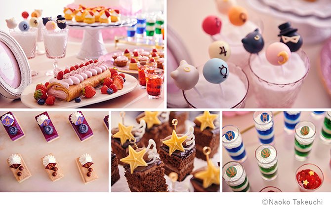 Los postres incluyen una gran variedad, que va de lollipops, pastelillos, gelatinas y más. El pastel principal también viene en distintas variedades. El paquete incluye cocteles sin alcohol, inspirados en las diez Sailor Scouts.