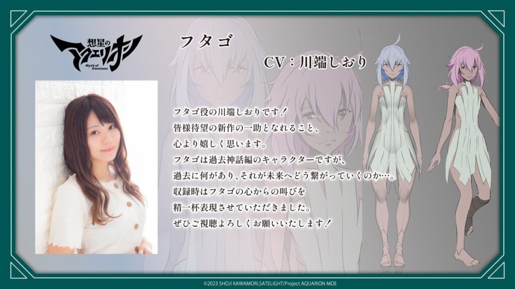 El staff de la cuarta serie de la saga Aquarion, titulada Sousei no Aquarion: Myth of Emotions reveló un nuevo video promocional y el nuevo cast para el arco Kako Shinwa-hen (Past Myths Arc). El arco narra mitos pasados que representan el mundo hace 12.000 años, y es una parte vital de la historia. El video también muestra una vista previa del ending Kokuhaku (Confession) interpretado por AKINO de Bless4.