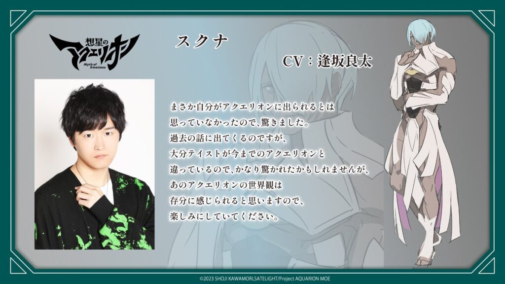 Aquarion se estrenó en 2005 y contó con dos secuelas: Aquarion Evol y Aquarion Logos, que se estrenaron en 2012 y 2015 respectivamente. Sobre Sousei no Aquarion: Myth of Emotions, Shoji Kawamori dijo que espera que esta cuarta serie logre llevar a los fans “un nuevo mundo nunca antes visto”. Se espera que en la próxima AnimeJapan se den a conocer más detalles de esta producción.