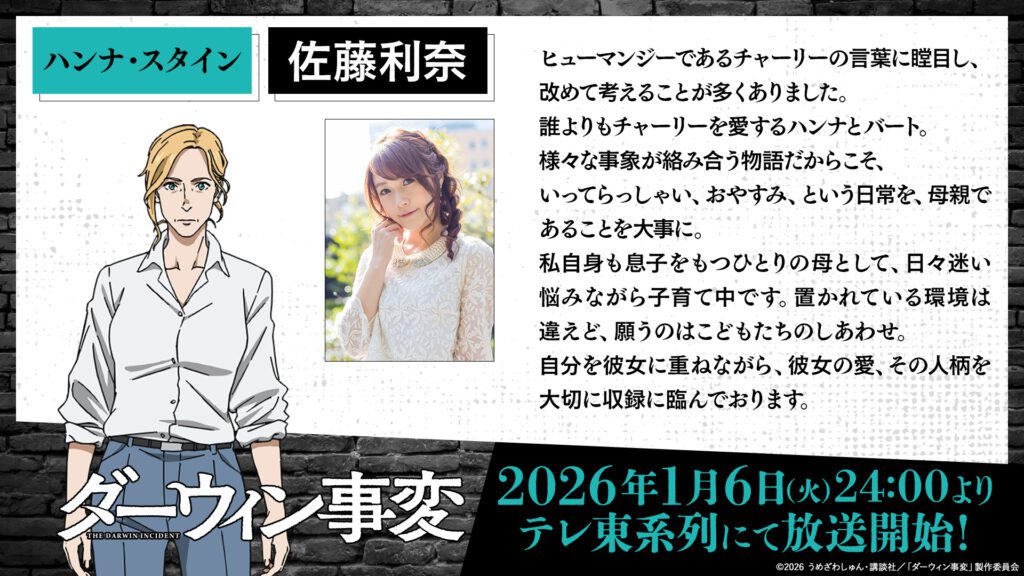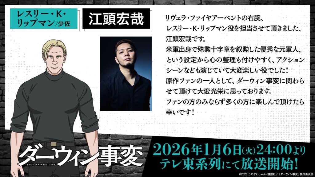El sitio web oficial de la adaptación animada del manga The Darwin Incident (Darwin Jihen) de Shun Umezawa estrenó un nuevo tráiler el viernes que revela que el anime debutará el 6 de enero.