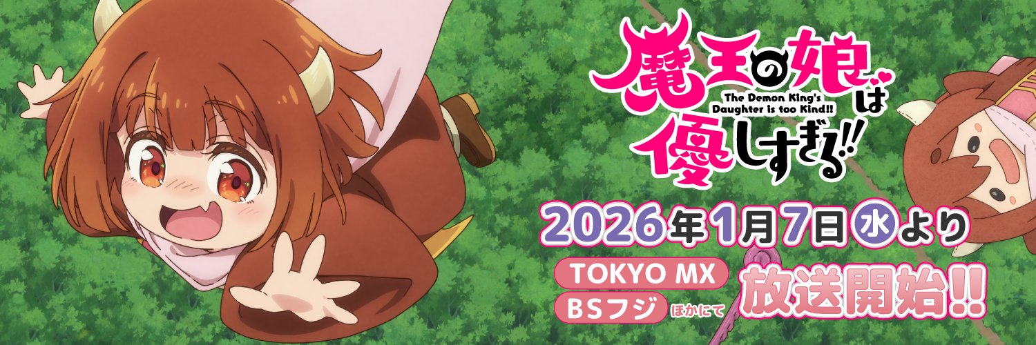 El sitio web oficial de la adaptación animada del manga de Yuya Sakamoto The Demon King’s Daughter Is Too Kind!! (Mao no Musume wa Yasashi Sugiru!!) reveló el tráiler y visual principal del anime, nuevos miembros del cast, y su debut para el 6 de enero. El tráiler muestra una vista previa del opening We Can Do!! interpretado por Kaori Ishihara, y el ending Ikko Nikoniko interpretado por Jahy (con la voz de Ayaka Ohashi), Dou (con la voz de Misaki Kuno) y Ahriman (con la voz de Akio Otsuka).
