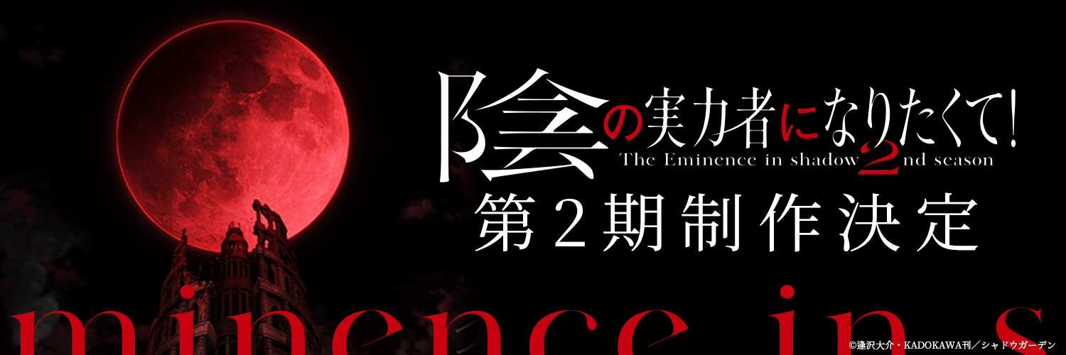 La adaptación como anime de The Eminence in Shadow anunció mediante un evento especial que contará con una segunda temporada próximamente. El staff del estudio Nexus que estuvo a cargo de la primera temporada continuará trabajando en la secuela. La primera temporada está disponible a través de HIDIVE.
