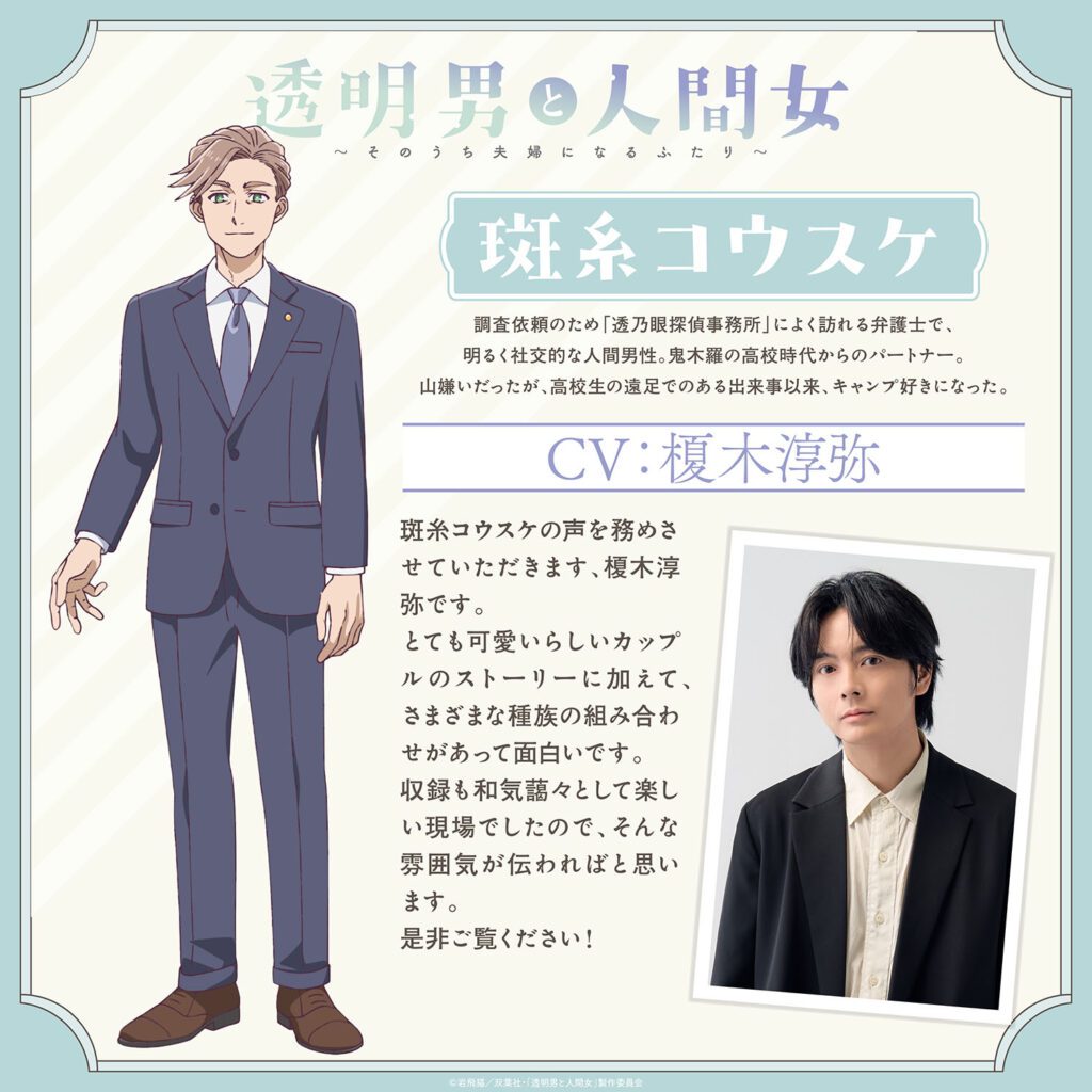 Junya Enoki como Kousuke Madaraito, un abogado que ha sido compañero de Kikira desde la secundaria.