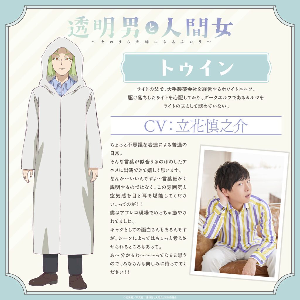 Pony Canyon reveló dos nuevos miembros del cast y el segundo tráiler para el anime The Invisible Man and His Soon-to-Be-Wife (Tomei Otoko to Ningen Onna: Sono Uchi Fufu ni Naru Futari). El video muestra una vista previa del opening Ding-dong interpretado por Mao Abe. La serie se estrena el 8 de enero.