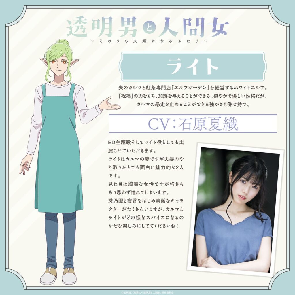 Kaori Ishihara como Light, una elfa blanca gentil y amable que coadministra la tienda de té con su esposo Karma.